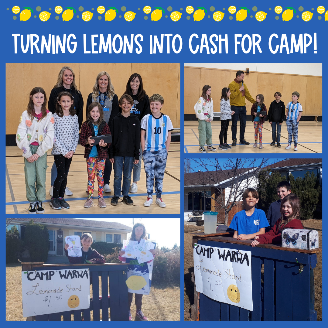 Angel decided to have a lemonade stand to raise money for the Grade 4 trip to Camp Warwa. As many good ideas do, it snowballed. Soon her friends joined in and they were selling fruit snacks too. Grace, Blake, Marley, Benjamin, and Aalyshia joined Angel and sold lemonade for four days together. Marley turned a family milk carton costume into a lemonade drink box mascot to help attract customers. Together the group raised over $560. They decided to use the money to reduce the cost of every grade 4 student by $9 each. Thank you!