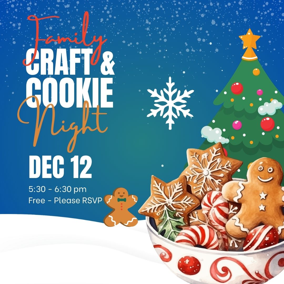 Please join us on Thursday, December 12 from 5:30 – 6:30 pm to decorate cookies & craft with your family! The supplies will be provided – and we will have hot dogs available too! There is no cost for this family fun night!