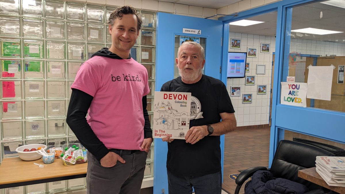 Ken Hawkins, from the Devon Historical Society, came by to bring Devon colouring books to the Grade 1 students!