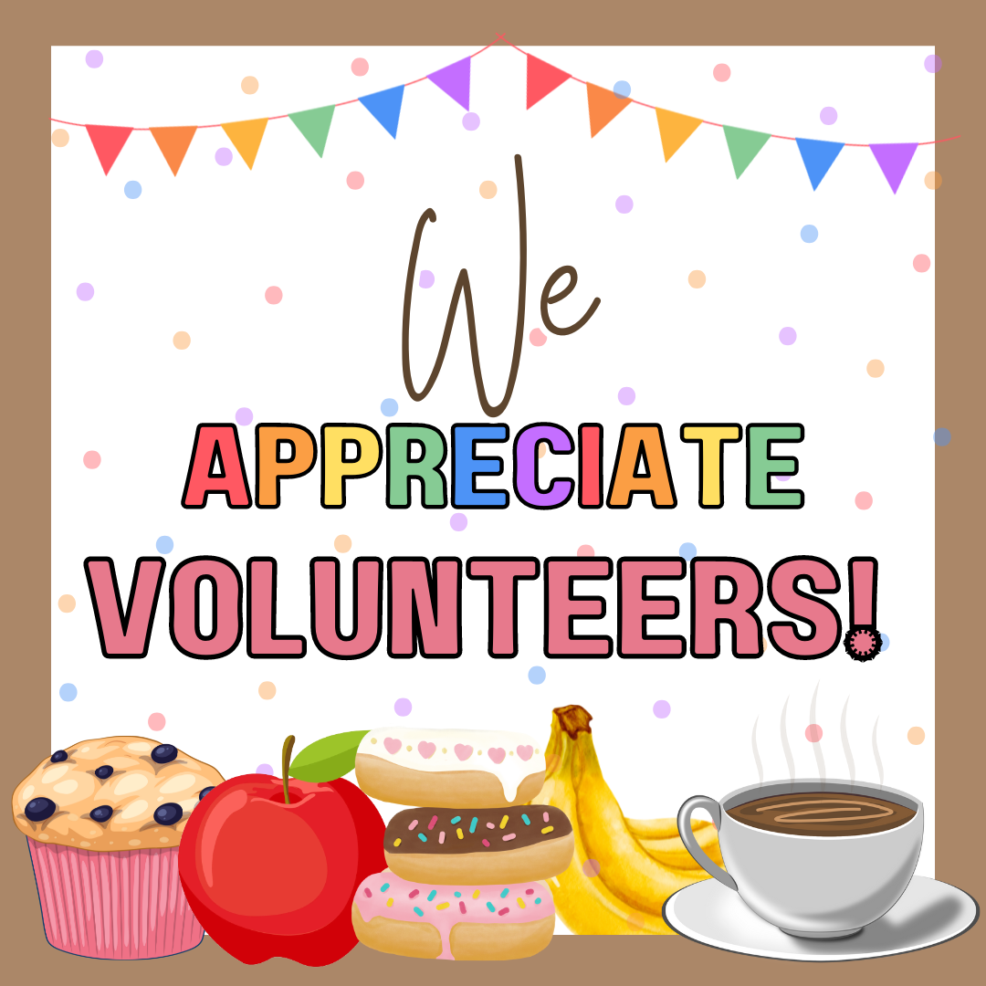 Please join us on Friday, May 31 for our Volunteer Appreciation event! Drop in anytime between 7:30 and 9:30 a.m. and grab some delicious treats. You can grab & go or stay and visit. Everyone who has volunteered at the school this year is invited! Whether you volunteered to tie skates, read in the classroom, or went on a field trip, we greatly appreciate your time!