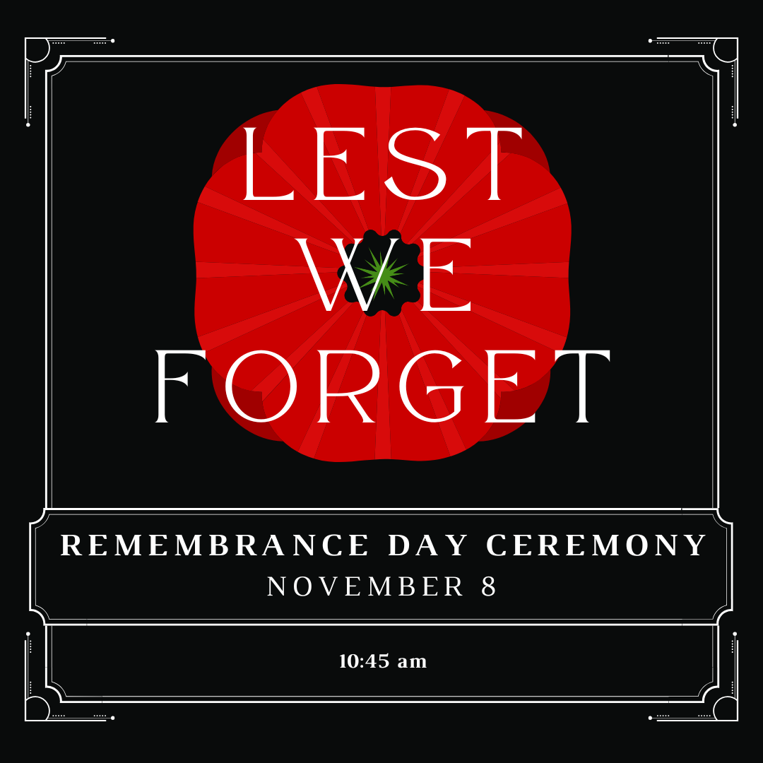 Next Friday, we will take a moment to pause, reflect, and remember. The Remembrance Day Ceremony will begin at 10:30. The community is welcome.