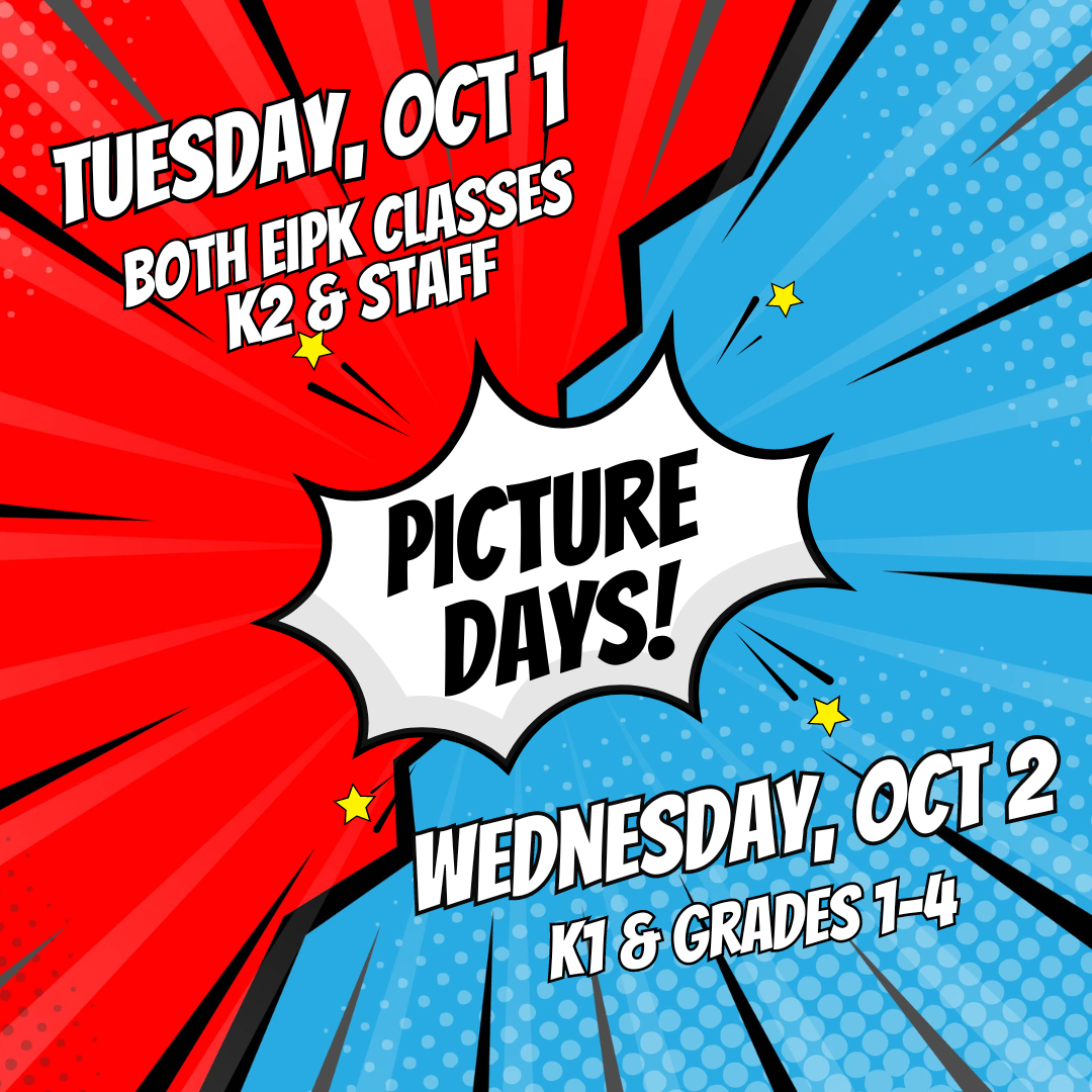 Tuesday, October 1 – Both Mrs. Porter’s EIPK classes and Mrs. Dupont’s K2 class will have their photos taken on Tuesday. (Please note there is no school on Monday, September 30).